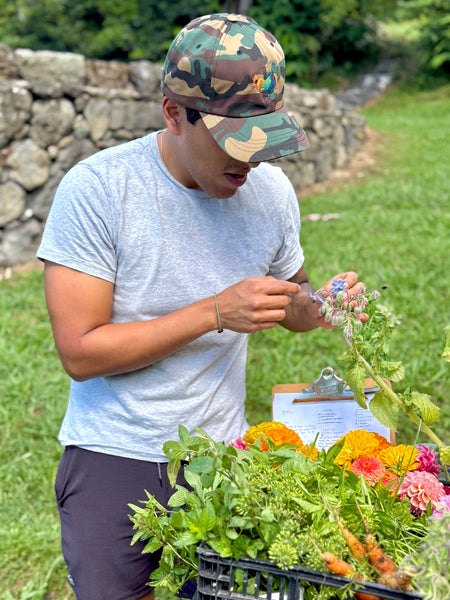 Guests begin with a guided harvest from the gardens, selecting ingredients for the day’s cooking. In the farmhouse kitchen, participants prepare and cook together, guided by Margo and Manny through seasonal cooking and thoughtful composition.
